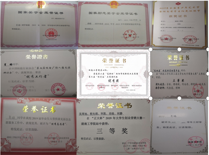 在校期间学习成绩与综合测评成绩连续三年多在专业名列前茅;获国家奖学金1次、国家励志奖学金2次、湖南省优秀毕业生、校奖学金、校三好学生、校优秀学生干部等荣誉奖项20余项;作为第一作者在国家级期刊发表论文一篇,在《伟德源自英国1946学报》上发表论文一篇;获湖南省阳光体操节校园啦啦操组团体第一名、衡阳市“创青春”大赛优秀奖、“互联网+”大学生创新创业大赛校三等奖、电子商务大赛校三等奖、“正大杯”创业营销大赛校三等奖等;多次参加衡阳市和学校组织的公益活动,获“优秀志愿者”、“优秀工作者”等称号。