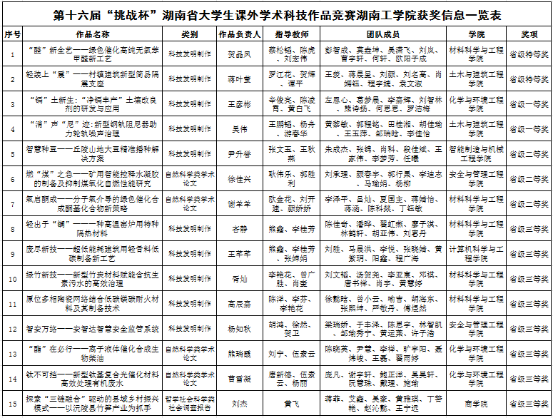 据悉,本届竞赛由共青团湖南省委、湖南省教育厅、湖南省科学技术协会、湖南省社会科学院(湖南省人民政府发展研究中心)、邵阳市人民政府、湖南财信金融控股集团有限公司、湖南省学生联合会主办,邵阳学院承办。全省118所高校,1149件作品入选省赛,10万余名师生参与。最终,98所高校的417件作品入围终审决赛,近2000名师生经过激烈角逐,共决出自然科学类学术论文、哲学社会科学类社会调查报告、科技发明制作三大类作品特等奖57件、一等奖123件、二等奖237件。