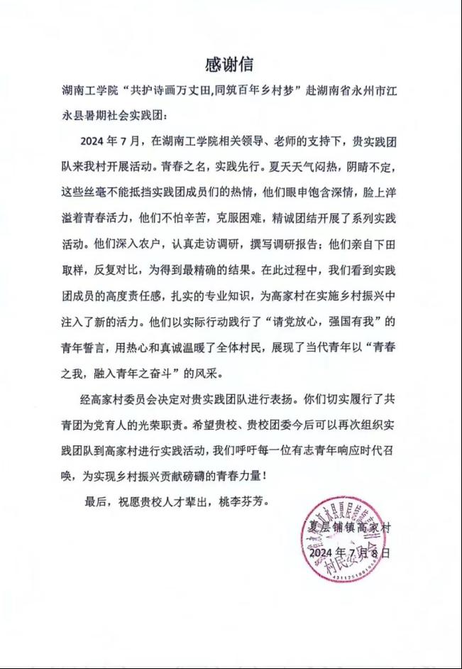 图 10江永县高家村委给予团队感谢信