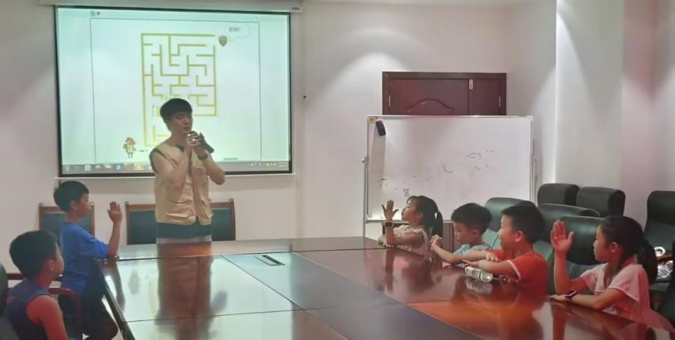 课堂上,主讲人苏瑞杰以Scratch为主要教学工具,通过设计互动游戏和基础学习活动循序渐进对于年龄较小或尚未上学的小朋友进行教学;对于年纪较大的学生,开课老师适当增加教学内容,提高学习难度,再让他们独立完成编程作品。