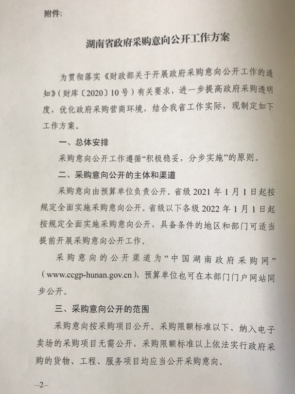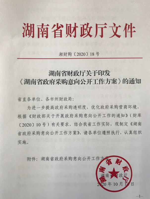 湖南省财政厅关于印发《湖南省政府采购意向公开工作方案》的通知